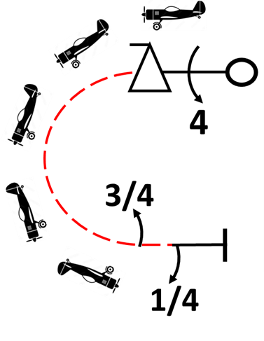 Regardless of the airplane you fly, this figure it is going to hurt. One ideally ought to be very slow on the top before the push around, because you are going to accelerate tremendously as you push the nose down and under. But in order to execute a neat 4-point roll followed by a snap roll in the opposite direction, you need speed, and so you are forced to start the push at between 80 to 90 knots, you risk being through VNE at the bottom. And so, if you want to control speed, and also minimize height loss to under 1000’ you have to push like hell (as in use both hands and all your might) about -6G to -7G will be required. This will result in painful bruising on your thighs, and sometimes even bleeding as even the most padded of seat belts cut into your legs. This figure will also result in red blood shot eyes as the fine capillaries in the whites of your eyes burst with the intense rush of blood to the head.